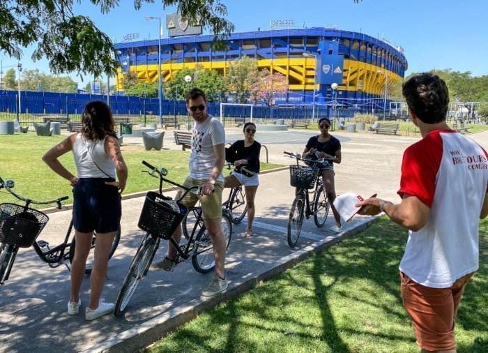 Je fietst verder door de parken en steegjes van de stad naar de kleurrijke volkswijk La Boca, waar je een korte pauze inlast voor een wandeling of een verfrissing. Een van de beroemde voetbalteams van de stad, Boca Juniors, komt uit dit deel van de stad en je fietst vlak langs hun grote stadion dat geel en blauw is geschilderd.