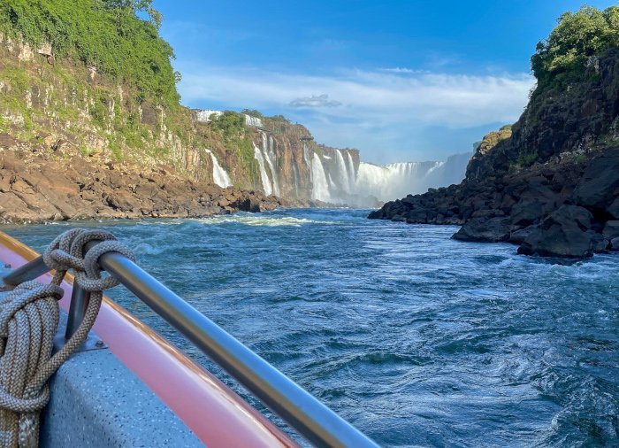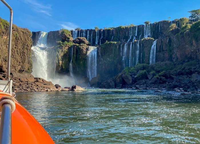 Je ziet de reusachtige watervallen van onderaf en aan het eind vaar je onder een van de kleinere watervallen door, zodat je kunt opscheppen dat je een douche hebt genomen in de Watervallen van de Iguaçu! Natuurlijk beslis je helemaal zelf of je zin hebt om je midden tussen de watervallen te begeven. Maar je zult hoe dan ook onderweg zeker doorweekt raken, dus het is een goed idee om je om te kleden in zwemkleding of een regenponcho te dragen. Je krijgt een waterdichte tas voor je waardevolle spullen.