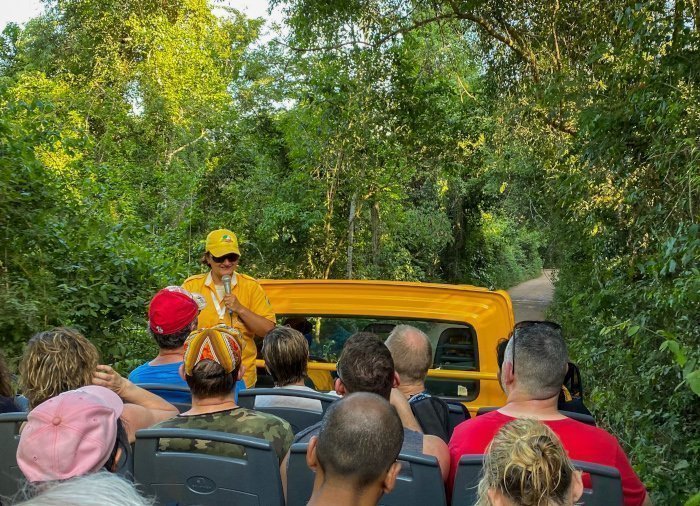 Het eerste deel van de tocht gaat per 4WD bus door de jungle over een 5 km lange grindweg naar de haven. Vanaf hier leidt een steile trap naar beneden naar de haven, waar een speedboot klaarligt om je over de rivier naar de bulderende watervallen te brengen.