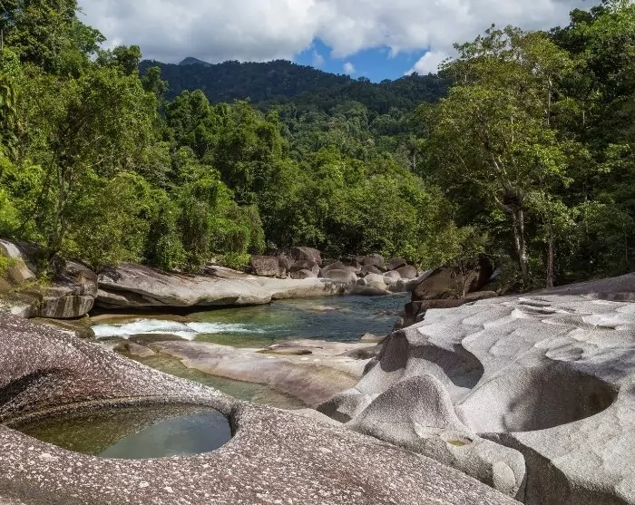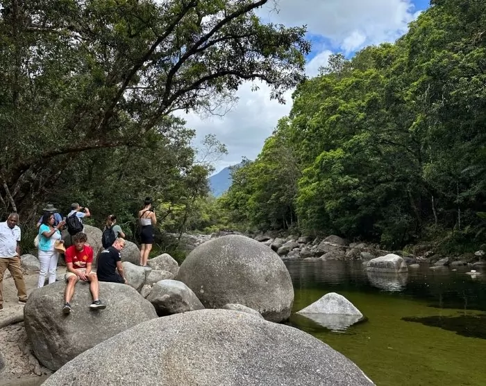 Na Mission Beach nadert u Cairns, maar voordat u daar aankomt, komt u langs Babinda en de beroemde Babinda Boulders. Dit prachtige gebied biedt natuurlijke waterpoelen en gladde rotsformaties, perfect voor een verfrissende duik en een koffiepauze.
