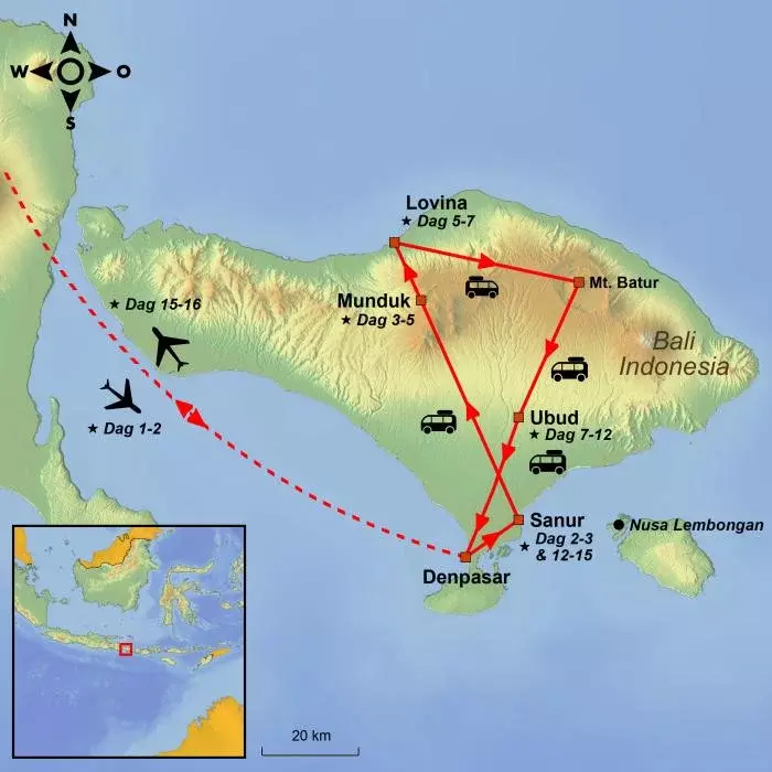 De reis eindigt in de badplaats Sanur, waar u kunt genieten van de gouden zandstranden en de vele indrukken kunt verwerken.