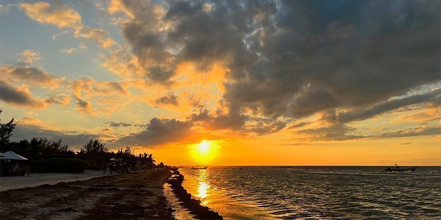 Het tropische eiland Isla Holbox, omgeven door kristalhelder water, witte stranden en wuivende palmbomen, is op zijn mooist bij zonsondergang wanneer de lucht verandert in een canvas van kleuren. Het natuurlijke fenomeen van bioluminescentie zorgt ervoor dat micro-organismen als kleine lichtjes in het water fonkelen, waardoor het tafereel nog magischer wordt – vooral tijdens de nieuwe maan.