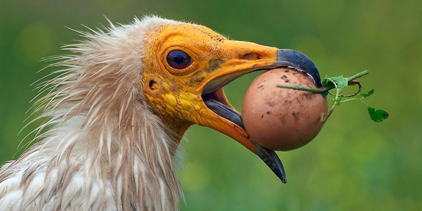 De Egyptische gier (Neophron percnopterus) eet meer dan alleen kadavers en staat bekend om het gebruik van stenen om struisvogeleieren open te breken en daarna op te eten.