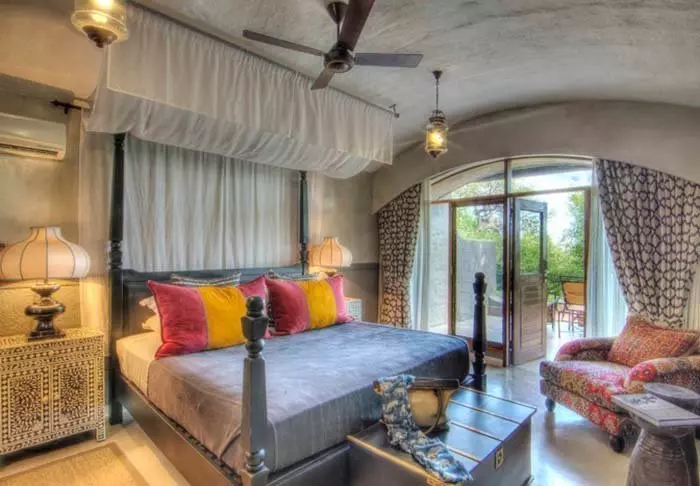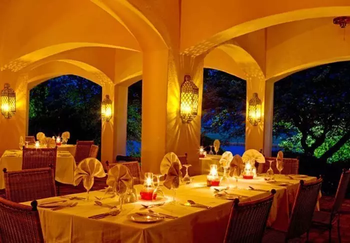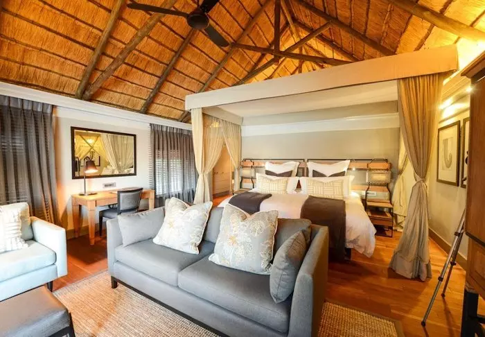 De hele lodge is mooi ingericht in Moorse stijl met gewelfde plafonds, lantaarns, grote kussen en een fijne en smaakvolle mix van neutrale en felle kleuren. Er zijn restaurants, twee bars, zes lounges, een winkeltje, zwembad, spa, boma en een grote tuin met volop ruimte.