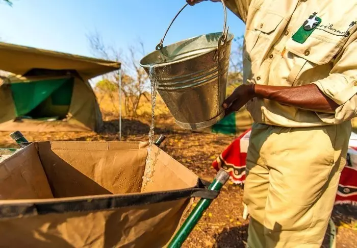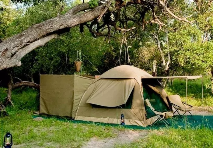 Buiten de tent is een kleine schaduwrijke luifel met stoelen, zodat je kunt genieten van het uitzicht op de natuur om je heen. Je slaapt op een comfortabel vouwbed met een lekker zacht matras, echte dekbedden en kussens en een klein nachtkastje. In het verlengde van je tent heb je je eigen bushbadkamer met douche en toilet. De tent heeft geen elektriciteit of stromend water, en de doorspoelfunctie van het toilet bestaat uit een hoopje aarde en een klein schepje – maar er IS wel een toilet! Meerdere keren per dag krijg je warm water en kun je je wassen in een kleine wasbak die in een rek buiten de tent staat. Als je de film ‘Out of Africa’ hebt gezien, weet je precies hoe het werkt. ‘s Middags wordt er water verwarmd en omhoog getakeld in een emmer met een douchekop eronder, zodat je lekker warm kunt douchen. Het is primitief, maar comfortabel, en het belangrijkste: het is overnachten op de voorwaarden van de natuur zelf, waarbij je geen sporen achterlaat terwijl je de wilde dieren in de delta van dichtbij meemaakt.