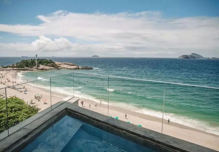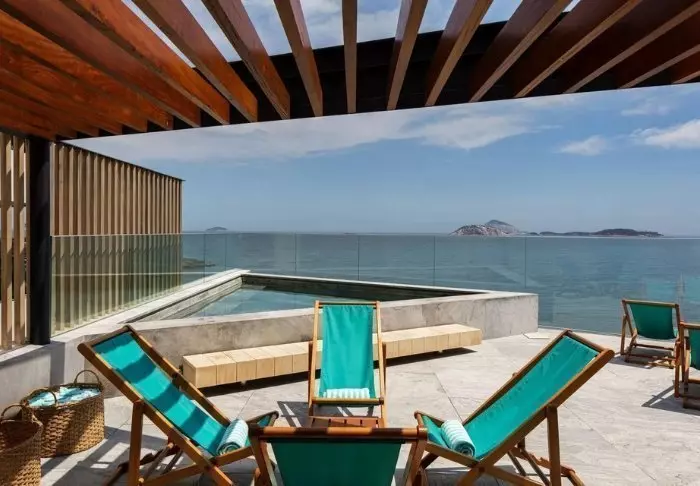 Het zwembad van het hotel bevindt zich ook op de bovenste verdieping, waar je kunt zwemmen in het zwembad of ontspannen in een ligstoel met uitzicht op Copacabana.