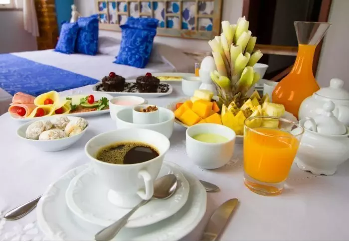 Het ontbijt wordt op het gewenste tijdstip op de kamer geserveerd en bestaat uit huisgemaakt brood, fruit en lokale lekkernijen, zoals tapiocapannenkoeken.