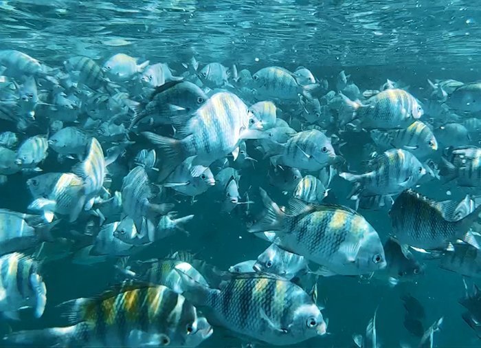 Je kunt aan boord snorkeluitrusting huren om de kleurrijke vissen onder het oppervlak te zien zwemmen.