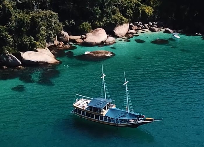 Zeil mee op een prachtige houten schoener tijdens een boottocht in de idyllische baai van Paraty.