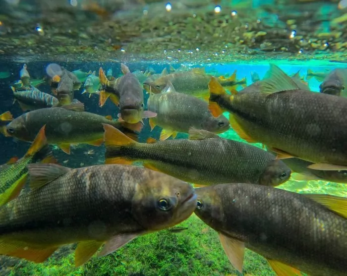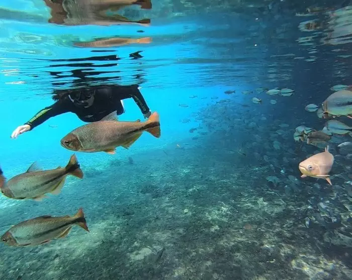 In Bonito kun je snorkelen in kristalheldere rivieren tussen kleurrijke vissen en waterplanten en een bezoek brengen aan de grote zinkput, Buraca das Araras, waar groenvleugelara’s (Ara chloropterus) leven en hun nesten bouwen in de spleten in de rotsen.
