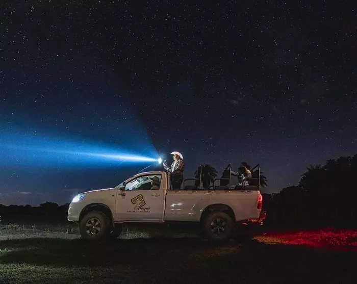 Een jeepsafari ‘s avonds, waarbij je ervaren gidsen gewapend met een zoeklicht op zoek gaan naar nachtdieren, zoals de jaguar, de ozelot, het gordeldier en de wasbeer, en naar nachtvogels zoals de uil.