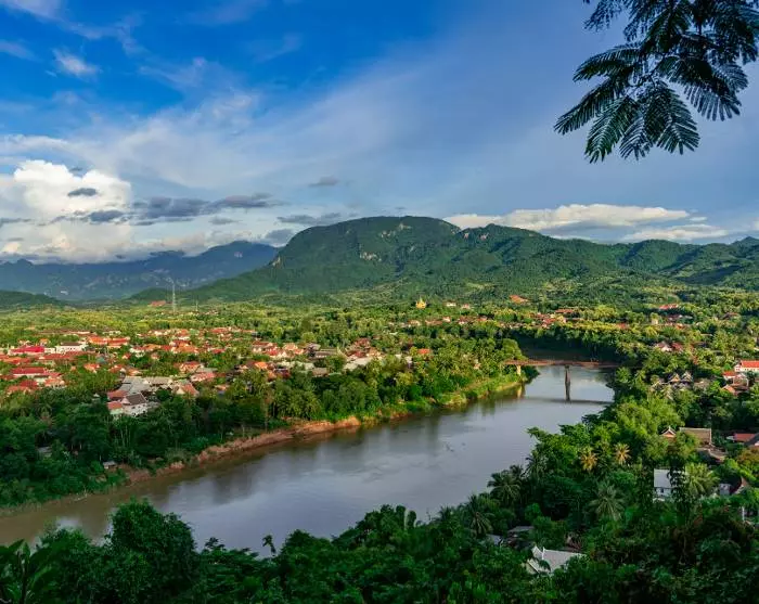 Het stadscentrum ligt op een schiereiland aan de samenvloeiing van de twee rivieren, Mekong en Nam Khan, en wordt omringd door een adembenemend landschap met beboste bergen, watervallen en grotten. De weelderige en groene elementen worden overal in de stad herhaald tussen mooie tempels en kleine charmante en rustige straatjes.