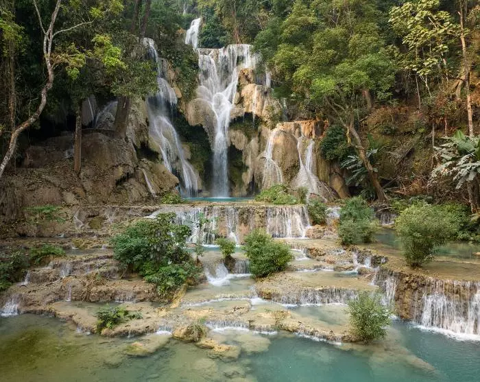 Na een heerlijke lunch wacht je een rit van 30 km ten zuiden van Luang Prabang naar de Kuang-Si-waterval. Misschien krijg je hier zin om een verfrissende duik te nemen? De Kuang Si-waterval wordt omgeven door weelderige, tropische jungle en stroomt in cascades over drie niveaus langs een steile helling omlaag. De langste val is 60 meter en op het laagste niveau kun je afkoelen in het turquoise water van de rustige baden.
