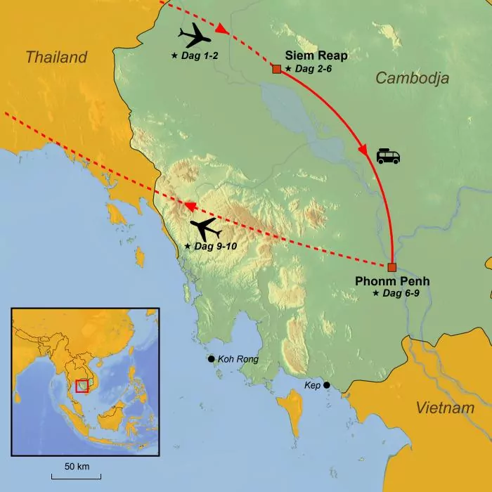De verlenging omvat een strandverblijf met 3 overnachtingen in het resort met ontbijt en transfers tussen Phnom Penh en het resort in Kep. Let op: Als uw rondreis eindigt in Siem Reap, omvat de verlenging ook een binnenlandse vlucht van Siem Reap naar Phnom Penh.