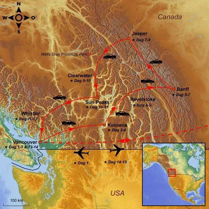 *Let op: vandaag verlaat u Alberta en reist u de provincie British Columbia binnen. U steekt bovendien een andere tijdzone over: British Columbia loopt één uur achter op Alberta.