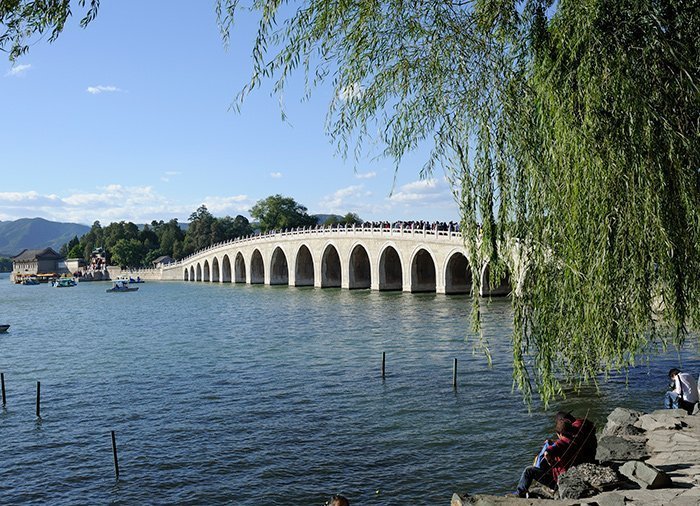 Vanuit de gang ziet u het Kunming-meer en het kleine eiland Nanhu, waar de Drakentempel en het Wangyan-paviljoen staan. Het eiland is bereikbaar via de prachtige Brug van de Zeventien Bogen. Dat er precies zeventien bogen zijn, is natuurlijk geen toeval. De negende boog die in het midden staat, symboliseert de keizerlijke macht en de acht bogen aan weerszijden van de negende boog symboliseren geluk en voorspoed.