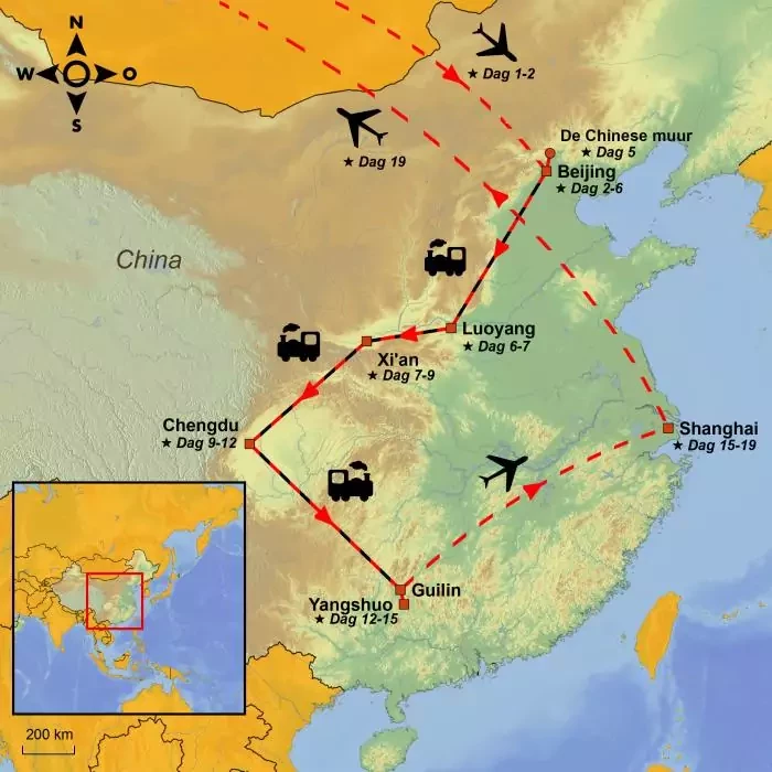 U begint in de keizerlijke hoofdstad Beijing, waar u het gigantische Plein van de Hemelse Vrede bezoekt. Achter de dikke, rode muren in het noorden ligt het machtige keizerlijk paleis van De Verboden Stad. Ten noorden hiervan ligt de kunstmatige Kolenheuvel, waar u bij helder weer een prachtig uitzicht heeft over het paleis en de bruisende hoofdstad.