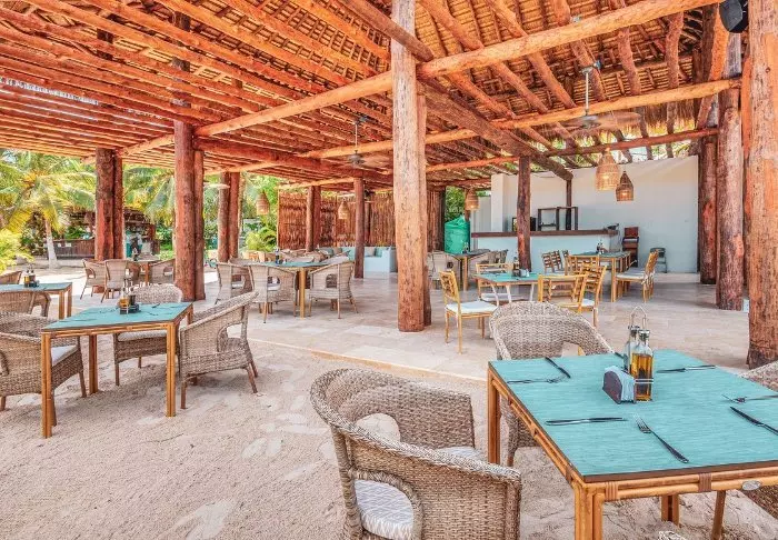 Maaltijden worden geserveerd in het charmante openluchtrestaurant, waar u onder de luifel of onder de blote hemel kunt dineren, allemaal met het adembenemende uitzicht op zee op de achtergrond. Het menu is een mix van lokale en internationale gerechten, met veel verse vis, zeevruchten, en exotische groenten en fruit.