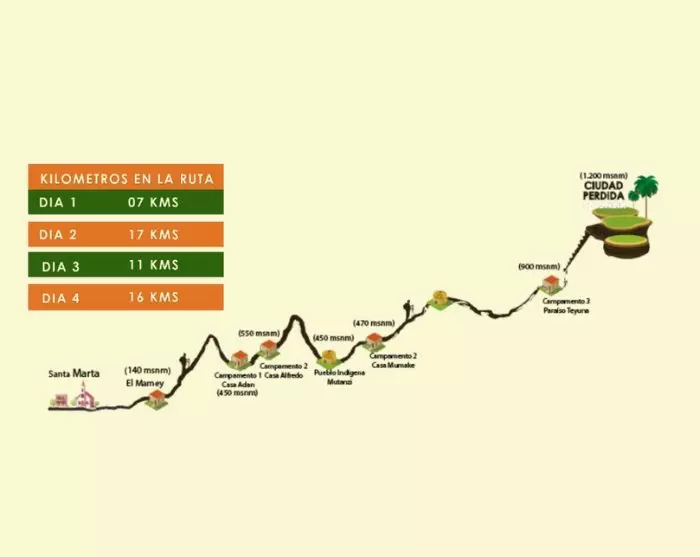 Vandaag begint uw trektocht naar de Lost City. Laat uw innerlijke Indiana Jones los, want dit avontuur lijkt op een mini-expeditie door de weelderige jungles van de Sierra Nevada Bergen. De tocht beslaat ongeveer 50 km en duurt vier dagen, waarbij u door terreinen reist met hoge temperaturen en vochtigheid. U overnacht in eenvoudige kampen langs de route. Uw bekwame gids zal u en uw groep leiden naar de indrukwekkende ruïnes van Ciudad Perdida, beter bekend als de Lost City. Wij verzekeren u dat hoewel de tocht uitdagend is, het de moeite waard is en waarschijnlijk een van uw mooiste herinneringen aan uw reis door Colombia zal worden.