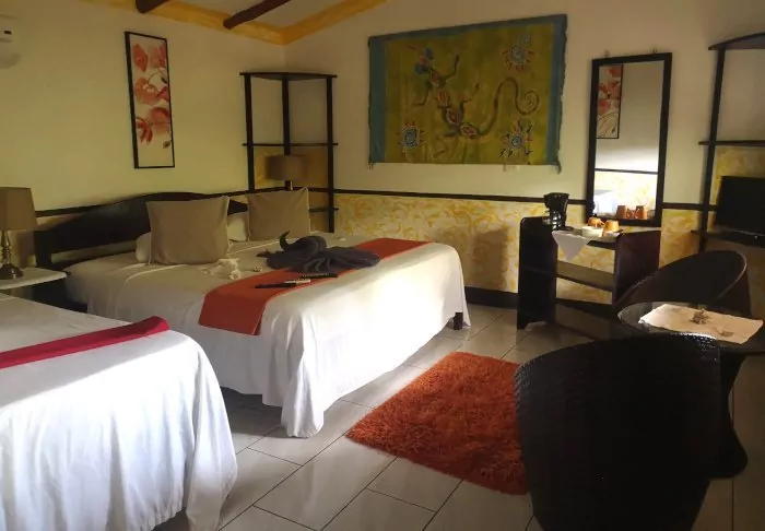 Het restaurant van het hotel kijkt uit over de prachtige tropische tuin, waar je van kunt genieten terwijl je ontbijt wordt geserveerd. Er zijn twee zwembaden in het meer privé gelegen gedeelte van de tuin, waar je een verfrissende duik kunt nemen of kunt ontspannen in een ligstoel. Je kunt zelfs het geluk hebben om apen, kolibries en leguanen in de tuin te zien.