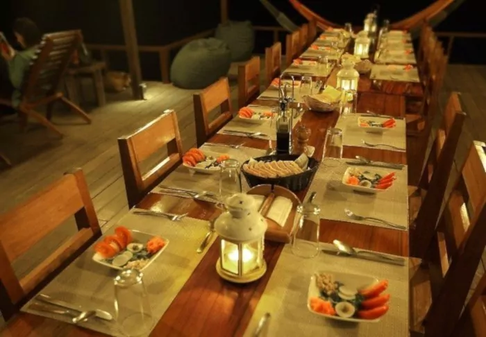 Je kunt ook genieten van de omgeving vanuit de lounge en het restaurant op de grote overdekte veranda waar ontbijt (inbegrepen), lunch en diner worden geserveerd. Het diner is een ervaring op zich, omdat het menu verschillende gerechten bevat die samen met de andere gasten rond een grote tafel worden gegeten, wat volop de gelegenheid biedt om met elkaar over de ervaringen van die dag te praten. Houd er rekening mee dat het diner tijdens het ontbijt moet worden geboekt en niet is inbegrepen.