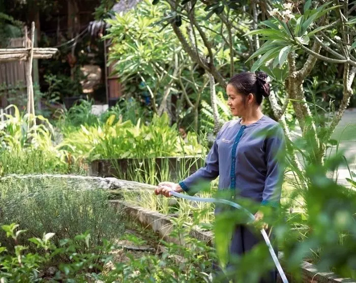 Santhiya’s ‘Growing Green’-initiatief richt zich op het minimaliseren van de milieu-impact door innovatieve, milieuvriendelijke oplossingen. De architectuur is geïnspireerd door traditionele Thaise bouwstijlen en is gemaakt van duurzaam hout. In hun eigen tuinen worden biologische groenten en kruiden verbouwd, waardoor de behoefte aan geïmporteerde goederen afneemt en u verzekerd bent van verse, lokaal geproduceerde voeding. Om hun energieverbruik te verminderen, past Santhiya energiebesparende oplossingen toe, zoals zonne-energie, LED-verlichting en waterbesparende installaties. Bovendien planten ze bomen op hun eigen terrein en bevorderen ze afvalscheiding en recycling om een circulaire economie te ondersteunen en hun CO₂-voetafdruk te verminderen.
