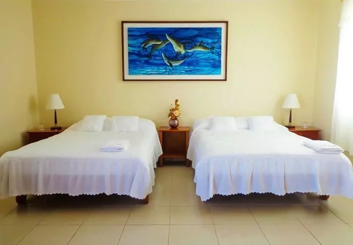 Er zijn hier slechts 16 kamers (4 standaardkamers en 12 standaardkamers met zeezicht). De kamers zijn eenvoudig ingericht, maar mooi en schoon met kleurrijke foto’s van de natuur en wilde dieren van de Galapagoseilanden aan de wanden. Alle kamers hebben een eigen badkamer, airconditioning, wifi en kabel-tv.