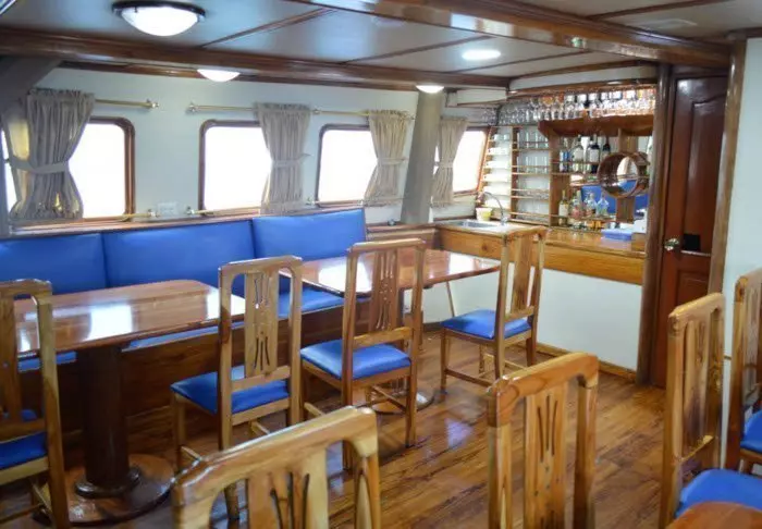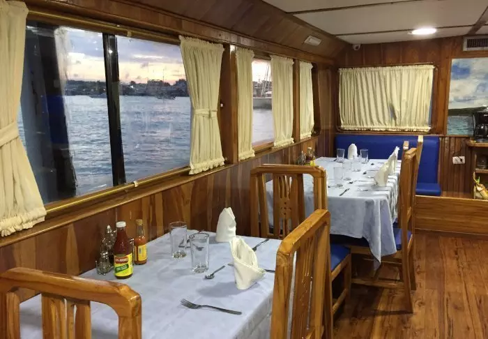 Er zijn meerdere gezellige gemeenschappelijke gebieden en een zonnedek waar je kunt ontspannen en met je medereizigers kunt praten over de ervaringen van die dag. Er heerst een gezellige, ontspannen sfeer aan boord, en zowel je gids als de bemanning doen er alles aan om ervoor te zorgen dat je geniet van een onvergetelijk verblijf op de Golondrina I.