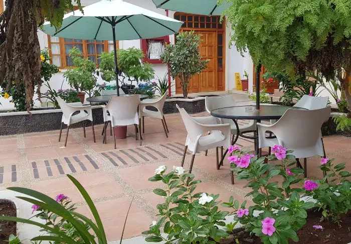 Het hotel heeft twee verdiepingen en 40 kamers rond de binnentuin, waar een gezellige bar en restaurant is, die de hele dag geopend is. Hier wordt ook het ontbijtbuffet geserveerd (inbegrepen).
