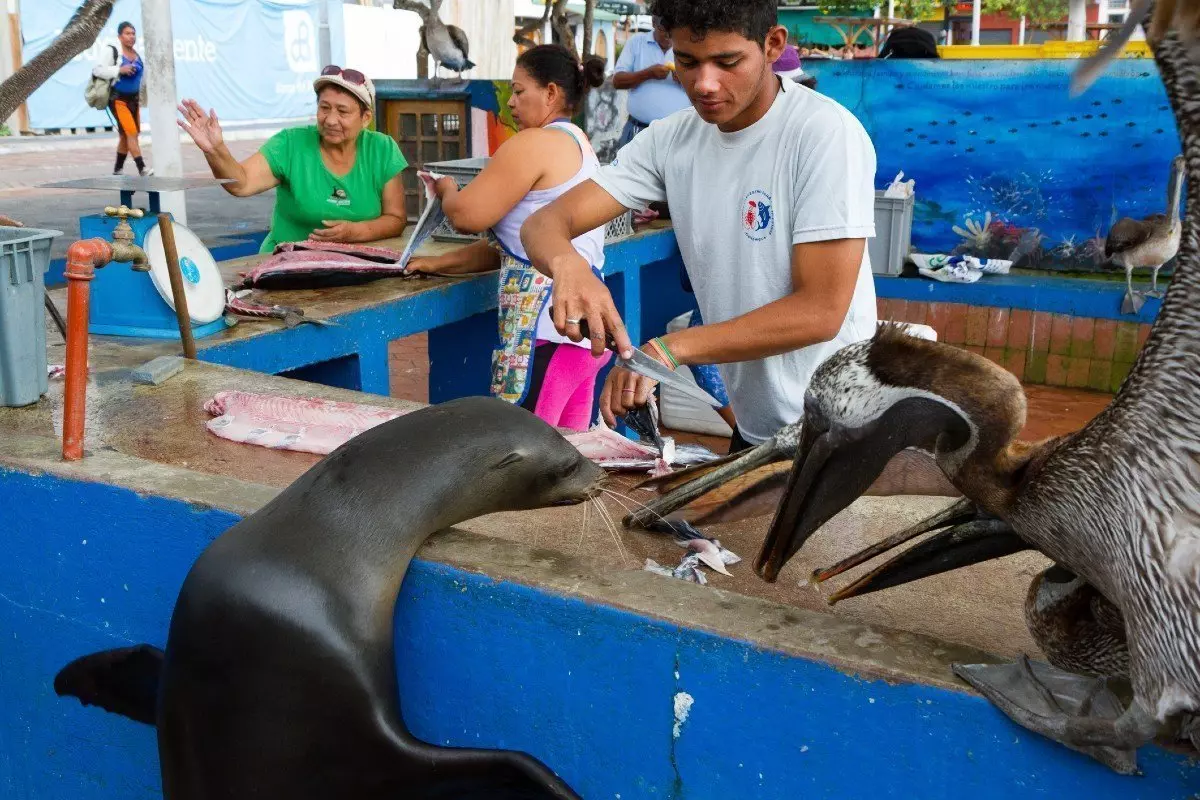 Je hebt twee dagen voor jezelf in Puerto Ayora. Als je vroeg opstaat, ga dan naar de kleine vismarkt op de Avenida Charles Darwin, die hongerige, nieuwsgierige zeeleeuwen en pelikanen aantrekt die hopen op een snack.