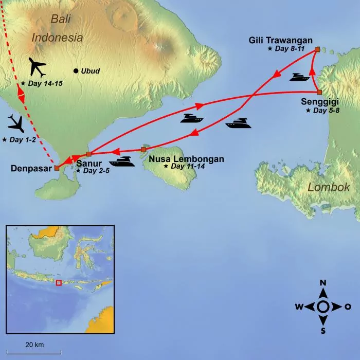 Vandaag wacht het vierde en laatste eiland van de reis, namelijk het kleine paradijselijke eiland Nusa Lembongan, gelegen ten zuidwesten van Gili Trawangan en ten zuidoosten van Bali.