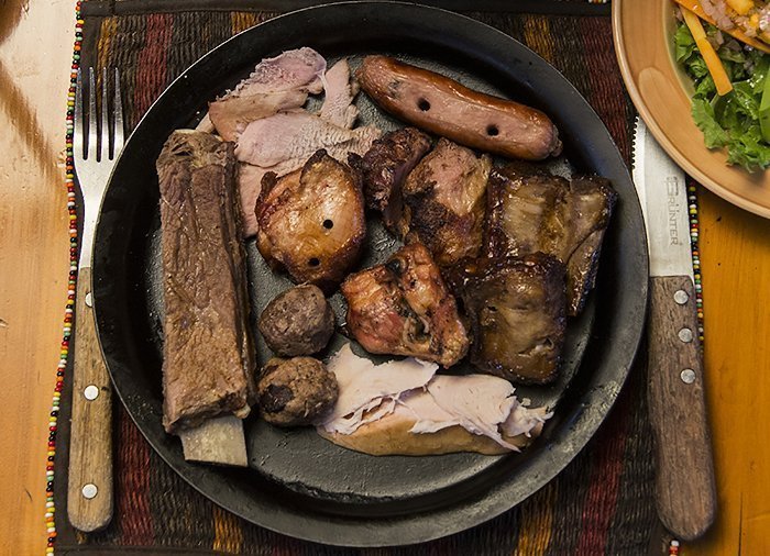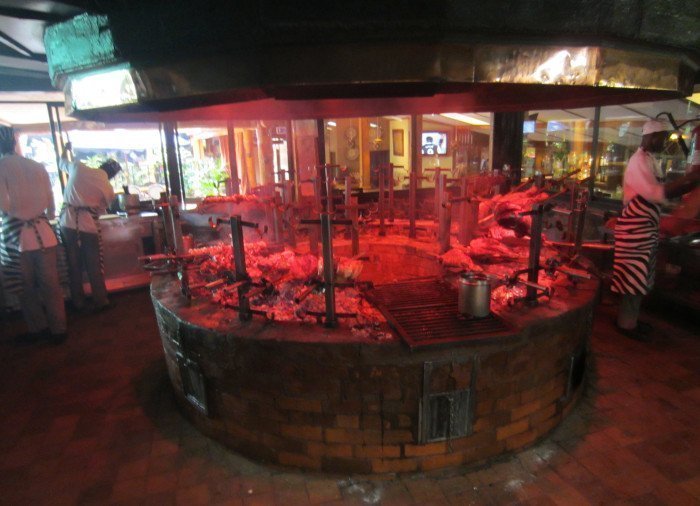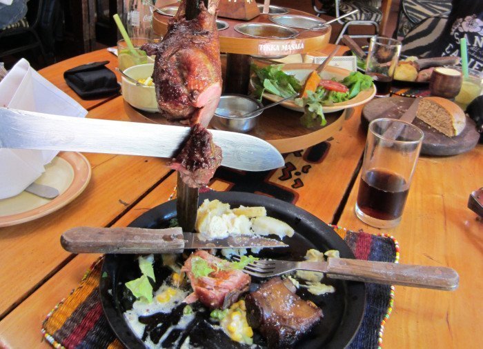 Het vlees wordt op traditionele Masai-wijze geroosterd op houtskool en het concept is “all you can eat” totdat u het opgeeft en het kleine vlaggetje bij uw tafel laat zakken.