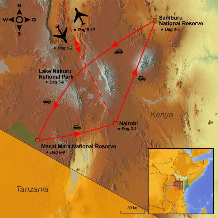 U kruist de evenaar en kunt heel dicht bij het fascinerende en gevarieerde dierenleven in de wildreservaten Samburu en Masai Mara komen. Eerstgenoemde heeft de ‘bijzondere vijf’ en unieke landschappen, en laatstgenoemde de karakteristieke acaciabomen die de dieren van de savanne schaduw geven. U rijdt door het prachtige landschap bij de 5.000 km lange Great Rift Valley met watervallen, vulkaankraters en het nationale park Lake Nakuru, dat bekend staat om zijn vele nijlpaarden. U krijgt ook gelegenheid de lange, in het rood geklede Masai in hun dorpen te bezoeken.