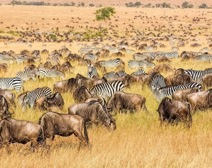 Van juli tot oktober kunt u hier de 1.200 km lange trek zien van meer dan een miljoen gnoes, honderdduizenden zebra’s en talloze Thomsongazelles. Tijdens deze trek – bij het oversteken van de rivier de Mara – valt een groot aantal dieren ten prooi aan enorm grote nijlkrokodillen.