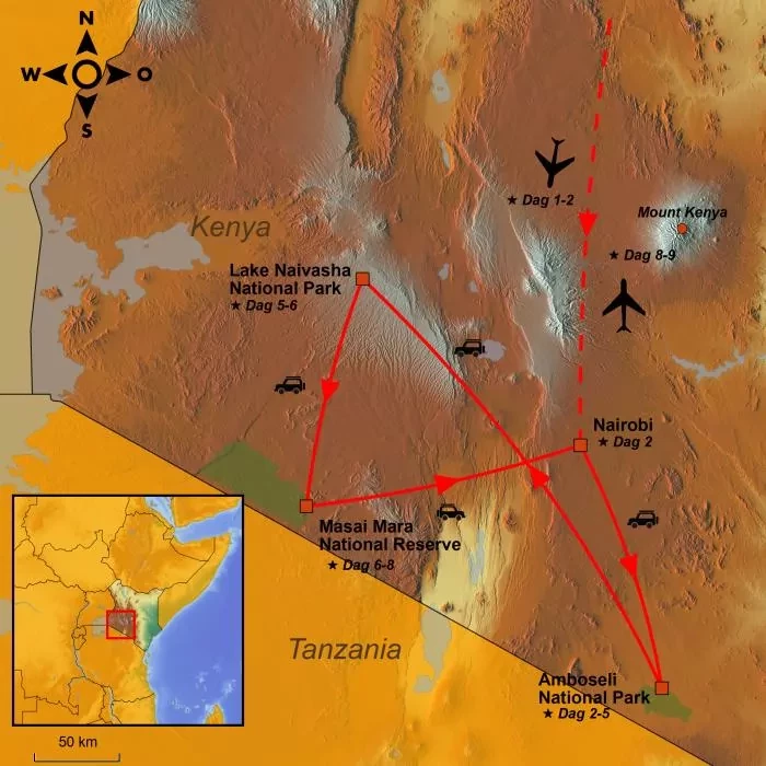 De reis begint in Nairobi, de hoofdstad van Kenia, waar je één nacht verblijft. De volgende ochtend gaat de reis naar een van de kleinste nationale parken van Kenia: Amboseli. Het park staat vooral bekend om zijn grote kuddes olifanten, die vaak poseren met de Kilimanjaro op de achtergrond. Het park is zo plat als een pannenkoek, het klimaat is droog en de vegetatie is schaars, waardoor het heel gemakkelijk is om de wilde dieren te zien.