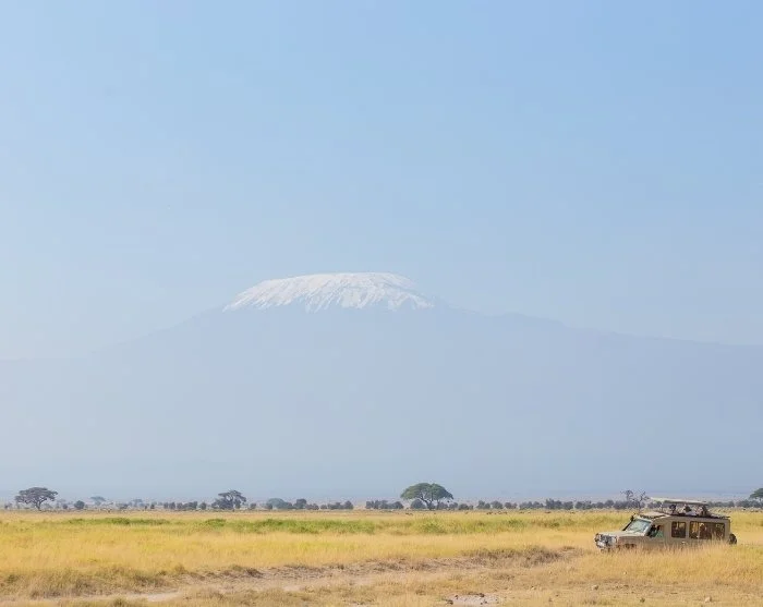 In Nationaal Park Amboseli torent de Kilimanjaro majestueus boven het vlakke landschap uit, terwijl olifanten langzaam voorbijtrekken en stofwolken achter zich laten.