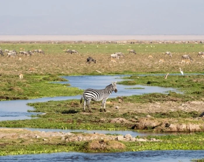 Natuurlijk is er het adembenemende uitzicht op de imposante Kilimanjaro, maar ook op dagen dat de berg achter de wolken schuilgaat, heeft Amboseli een onweerstaanbare en eigen charme. Het landschap bestaat uit een opvallende mix van contrasten – van stoffige vlaktes tot groene, moerassige stukken waar talloze vogels en ander wilde dieren samenkomen. Door de relatief lage begroeiing in het park is wild spotten extra makkelijk. Het landschap verandert drastisch gedurende de seizoenen: zo zijn er meren die in het droge seizoen geheel opdrogen en zich na een regenbui weer vullen.