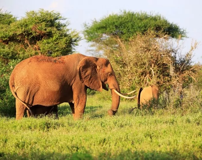 In Tsavo East heeft de grond een helderrode kleur, waardoor de wilde dieren een nogal opvallend roodachtig uiterlijk krijgen. Je kunt maar beter wennen aan de rode aarde – die kom je weer tegen als je in Madagaskar aankomt.