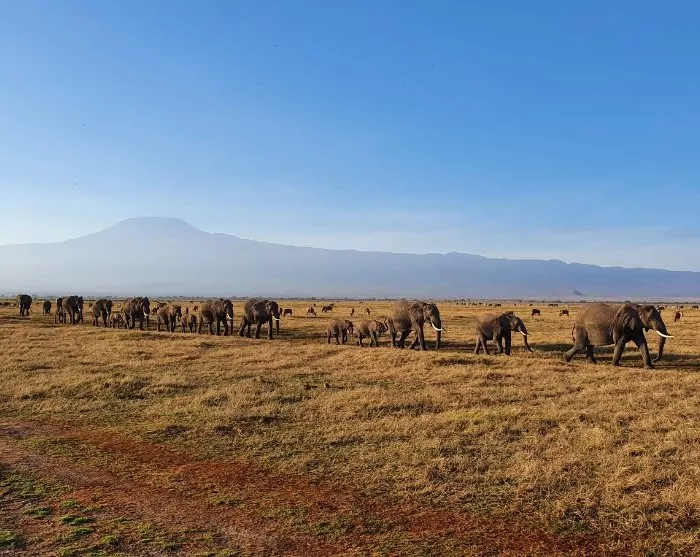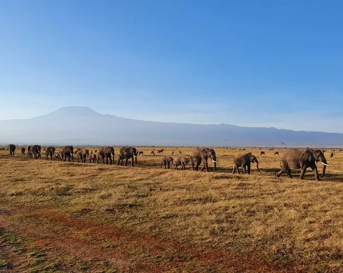 De reis gaat verder naar het prachtige nationaal park Amboseli. Amboseli mag dan een van de kleinste nationale parken van Kenia zijn, maar de aanblik van de olifanten – enigszins stoffig door het droge landschap – met de Kilimanjaro op de achtergrond is erg ontroerend.
