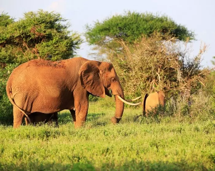 In Tsavo East is de aarde helderrood, waardoor de wilde dieren er enigszins rood uitzien. Het is een beetje vreemd als je voor het eerst een roodachtige olifant ziet!