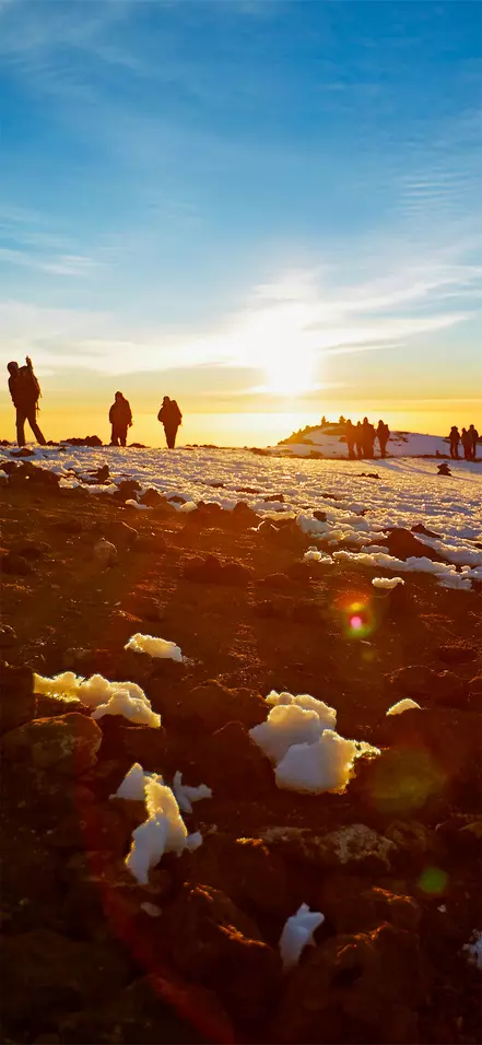 Rond middernacht staat u op en krijgt u een snack geserveerd voordat u in het donker begint aan de laatste klim naar de top. Het moeilijke terrein tijdens de ca. 6 uur naar Stella Point is voor de meeste mensen de grootste uitdaging. Het doel is Stella Point kort na zonsopgang te bereiken, zodat u hier kunt genieten van dit roodgloeiende schouwspel. We pauzeren niet lang, omdat het anders bijna onmogelijk wordt om weer op gang te komen als gevolg van de kou en de vermoeidheid. U loopt verder langs de kraterrand, met aan het eind een gelijkmatige stijging. Afhankelijk van het seizoen ligt er mogelijk sneeuw op het laatste traject voor de eindbestemming: de Uhuru Peak, de top van de Kilimanjaro en de top van Afrika. Als u de top heeft bereikt op 5.895 m hoogte, kunt u uzelf een schouderklopje geven, genieten van het fantastische uitzicht en ter herinnering een selfie maken bij het Uhuru Peak-bord.