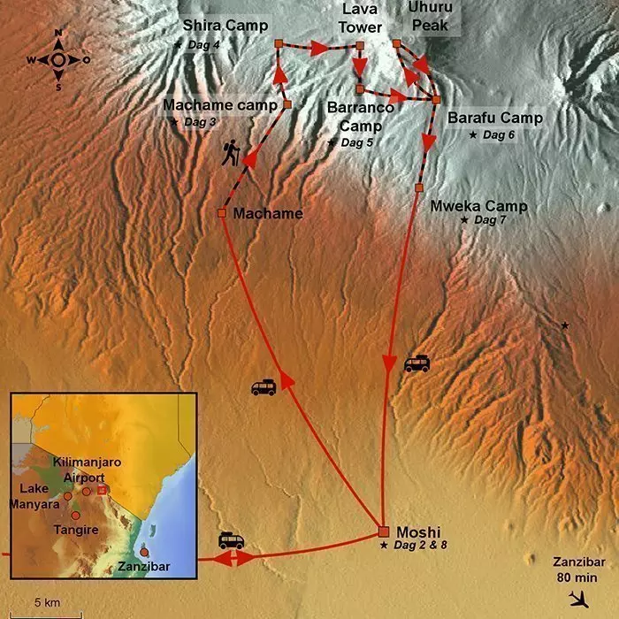 Na het ontbijt verlaat u Moshi om naar het dorpje Machame te rijden – een rit van 50 min. Hier ontmoet u uw team van gidsen, koks en dragers, die uw uitrusting klaarmaken en inpakken. Daarna gaat de tocht naar Machame Gate, de zuidwestelijke ingang van het Kilimanjaro Nationaal Park. Hier wordt u ingecheckt en geregistreerd, voordat u begint aan de wandeling door het regenwoud naar de top van de Kilimanjaro. De Kilimanjaro bestaat uit drie gedoofde vulkanen: Kibo met als hoogste punt Uhuru (5.895 m), Mawenzi (5.149 m) en Shira (3.962 m).