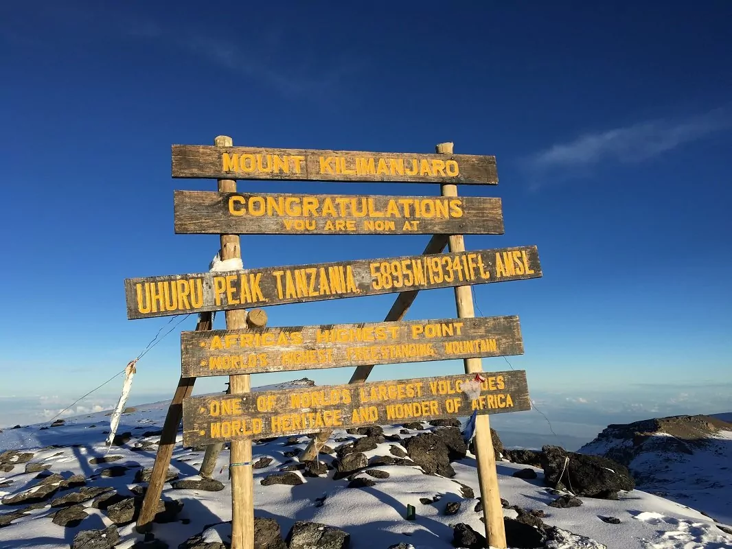 Omstreeks middernacht wordt u gewekt en na een snack gaat de beklimming naar de Uhuru Peak van start. In het donker tot aan zonsopgang op moeilijk terrein wandelen is voor de meesten het moeilijkste deel. Het doel is Stella Point bij zonsopgang te bereiken. Bij Stella Point pauzeert u om van de prachtige zonsopgang te genieten. Pauzeer niet te lang, want de koude en vermoeidheid maken het anders bijna onmogelijk om weer op gang te komen. U vervolgt uw tocht langs de kraterrand. De stijging op het laatste stuk naar Uhuru Peak is vrij constant. Afhankelijk van het jaargetijde kan er op het laatste deel van de route naar Uhuru Peak, ons uiteindelijke doel, de top van de Kilimanjaro en de top van Afrika, sneeuw liggen. Wanneer u de top op een hoogte van 5.895 m bereikt, kunt u zichzelf een schouderklopje geven en van het fenomenale uitzicht genieten. Misschien is het ook een leuk idee om een selfie bij het Uhuru Peak-bord te nemen, zodat u een blijvende herinnering hebt.