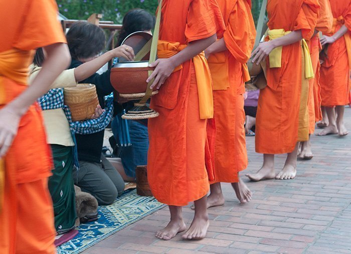 In de vroege ochtenduren bij het luiden van de tempelklokken, zult u getuige zijn van iets heel bijzonders in Luang Prabang. In de frisse ochtendlucht gaat een processie van meer dan 300 monniken elke ochtend in stilte door de straten om rijst en ander voedsel te verzamelen; aalmoezen die ze krijgen van de plaatselijke bevolking in hun karakteristieke bronzen kommen. Het ritueel is een traditie waarbij de monniken om voedsel vragen om hun nederigheid te tonen. Aalmoezen vragen is een belangrijke religieuze handeling in het boeddhisme en moet respectvol worden beantwoord door zowel de plaatselijke inwoners als de toeristen. Als u graag een aalmoes wilt geven, zal de gids u laten zien hoe u dit het beste kunt doen.