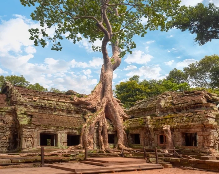 Na een korte rit komt u aan bij Ta Prohm, een tempel die duidelijk verschilt van de anderen. Hier hebben enorme bomen zich genesteld tussen de ruïnes, waardoor een betoverend schouwspel van natuur en eeuwenoude steen is ontstaan.