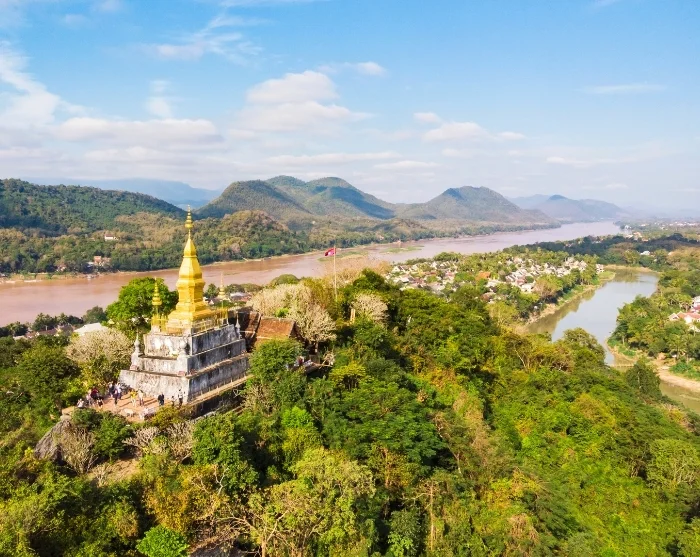 Uw reis gaat verder naar de Mount Phousi, op slechts één kilometer afstand. Hier wachten 328 treden op u, die u helemaal naar de top leiden. Onderweg passeert u kleine tempels en Boeddhabeelden, waar u even op adem kunt komen en kunt genieten van het uitzicht. Bovenop wordt u beloond met een adembenemend panorama over Luang Prabang, de rivieren, tempels en het weelderige landschap – allemaal prachtig omlijst door groene, golvende bergen.