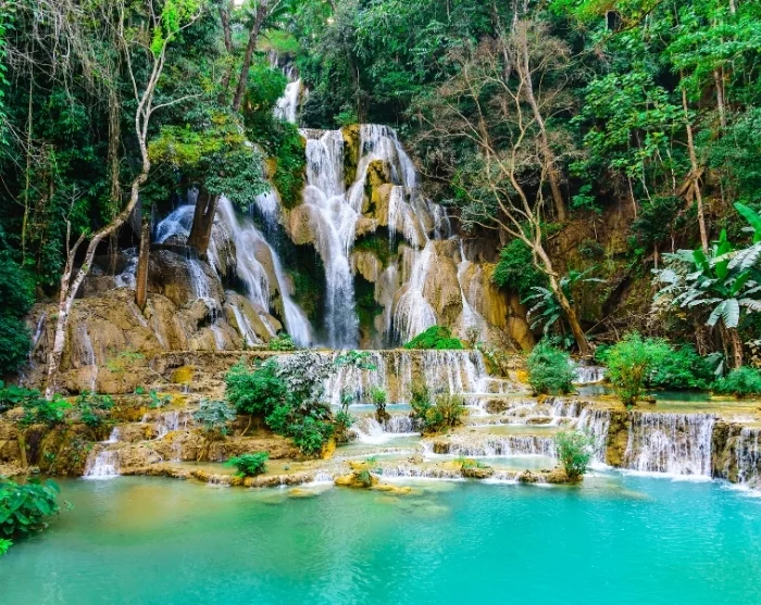Na een heerlijke lunch rijdt u 30 kilometer naar het zuiden om de Kuang Si-waterval te bezoeken. Midden in de tropische jungle stroomt het water over een steile heuvel in drie etages naar beneden. De hoogste val is maar liefst 60 meter en bij het onderste bassin kunt u een verfrissende duik nemen in het kalme, turquoiseblauwe water.