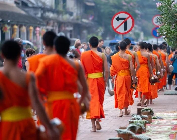 Elke ochtend, vroeg in de ochtenduren, vindt er in Luang Prabang een bijzonder ritueel plaats. Honderden monniken trekken stillekens door de straten om aalmoezen op te halen. Elke familie stuurt iemand naar buiten met eten of drinken, dat vervolgens in de schalen van de monniken wordt gedaan. De indrukwekkende stilte en het diepe respect waarmee dit dagelijks gebeurt, laten niemand onberoerd.