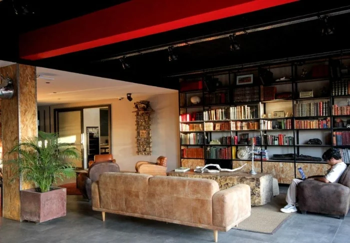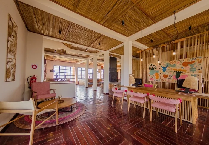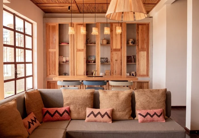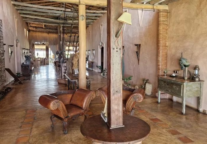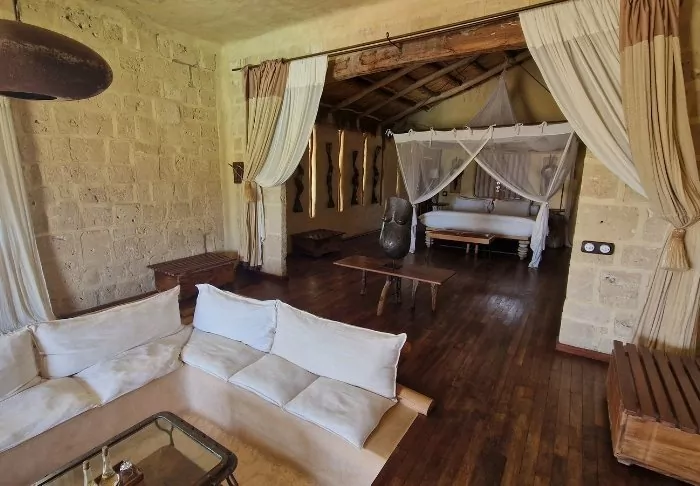 Binnen voel je duidelijk de invloed van het Afrikaanse continent. Bruine tinten, hout en steen domineren, maar op een luxueuze en smaakvolle manier. Alles is prachtig ingericht en het voelt bijna alsof je bij een particuliere kunstverzamelaar op bezoek bent.