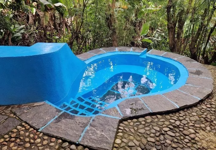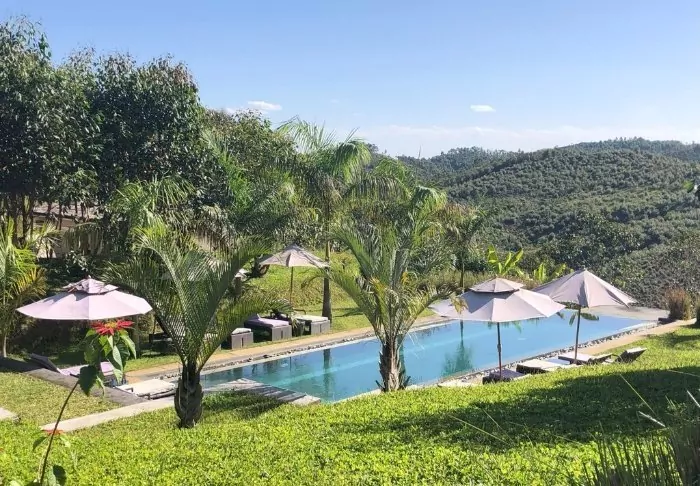 De lodge is gebouwd op een heuvel, dus je hebt een prachtig uitzicht vanuit het zwembad. Voor je ligt het regenwoud, dat niet zomaar een regenwoud is. Het is een origineel regenwoud uit de tijd dat alle continentale blokken van de aarde met elkaar verbonden waren en een supercontinent vormden.